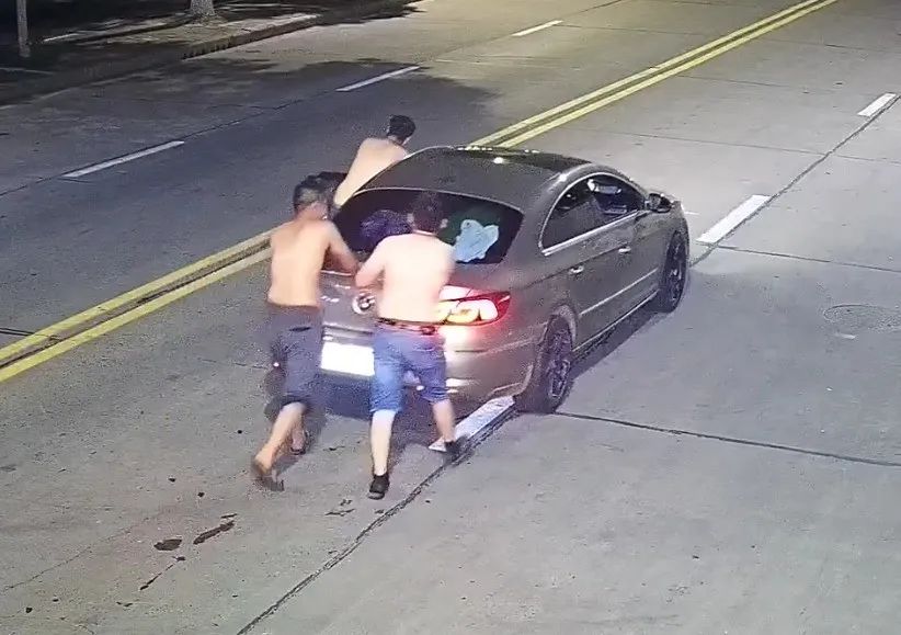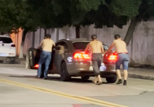 3名男子推行一辆小型汽车